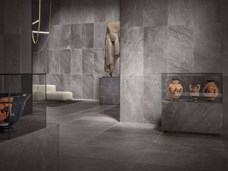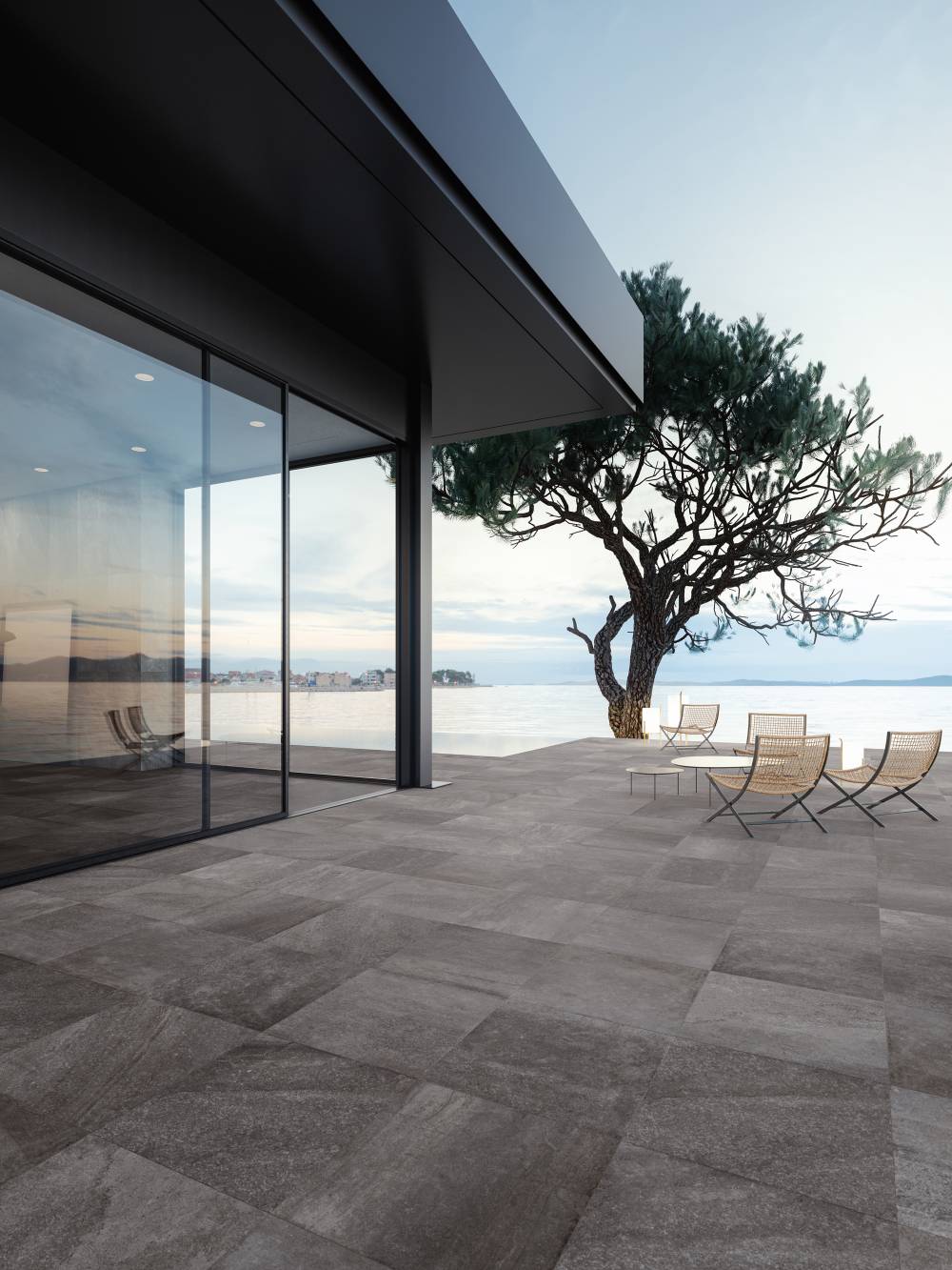 A natural style with a refined spirit: soft material effects interpret rocks, stones, sands, translated into fluid surfaces that transcend the border between indoor and outdoor areas. The collection originally combines different textures, more or less pronounced, to obtain a sustained, yet balanced rhythm.